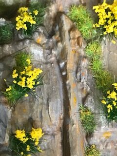 Un premier fond de couleur beige (Gesso dilué mélangé à la peinture) a été passé au fond du ruisseau. Selon les endroits, le fond pourra être de couleur ardoise voire même rouge pour certaines roches de nature granitique. Cette première mise en peinture permet de mieux figurer le parcours du futur ruisseau et de procéder à des éventuels ajustements. Vous pouvez ainsi à ce stade rajouter rochers et graviers en tant que de besoin.