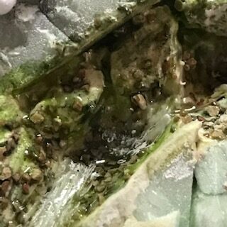 Pour figurer les remous, nous avons utilisé du coton hydrophile dont la première couche a été ajoutée avant prise complète de la résine. Si votre résine est trop liquide, le coton sera totalement absorbé par la résine et l’effet sera nul. Il faut qu’un peu de résine soit juste absorbée par capillarité par le coton.