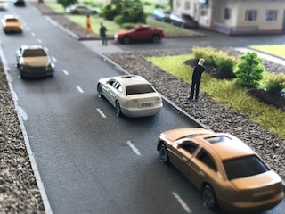 C’est peu apparent mais des traces de freinage ont été évoquées sur la route avec un crayon noir. Autant de modestes coins de modélisme plus réalistes arrachés de haute lutte ou presque… Rappelons le une fois encore, il ne s’agissait pas d’un projet de modélisme d’atmosphère…