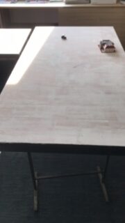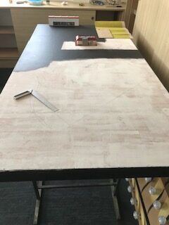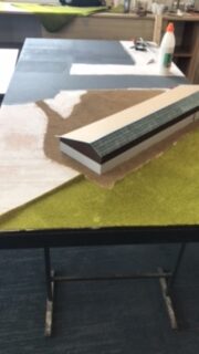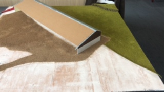 La première étape a consisté à partager le plateau en deux parties distinctes. Une peinture grise imitant le goudron vendue à cet effet a été appliquée pour bien distinguer la partie agricole de la partie péri-urbaine. Au préalable, la planche de contreplaqué avait été soigneusement poncée, enduite et poncée à nouveau pour assurer un bon état de surface.