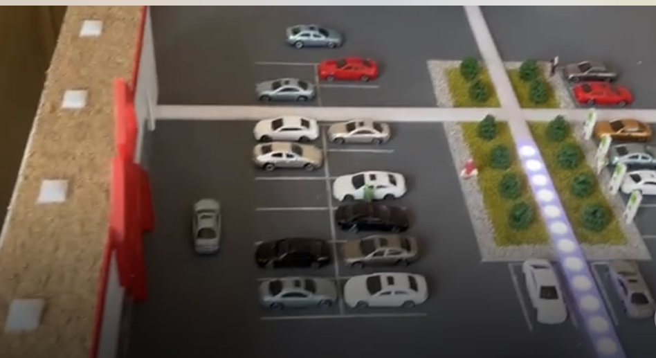 La maquette terminée… Cette vue d’ensemble suffit à voir qu’il ne s’agit pas d’une réalisation particulièrement fidèle. Il s’agit en effet d’un site imaginaire et les évocations ont été simplifiées. Le cœur du projet consiste en effet à mettre en valeur le métier de l’entreprise qui propose des solutions de panneaux solaires à installer sur des toitures agricoles. Ainsi, un hangar a été fabriqué de toutes pièces avec une toiture représentant des panneaux solaires. Une goulotte bien apparente, partant de la toiture (il s’agissait du cahier des charges), abrite un ruban de leds qui va desservir une zone d’activités composé d’un restaurant, d’un immeuble de bureaux et d’un magasin de bricolage.