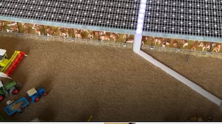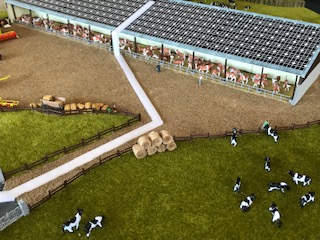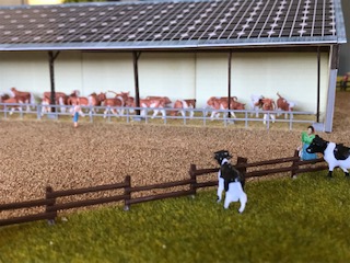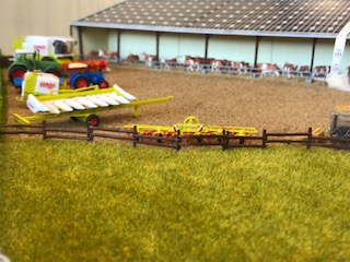L’intérieur du hangar agricole a été aménagé (on est très loin de méthodes d’élevage durables…). De la même façon, la cour a été dotée d’engins et de matériels agricoles de provenances diverses. Vous pouvez apercevoir à gauche la goulotte électrique dans laquelle un ruban led est inséré.