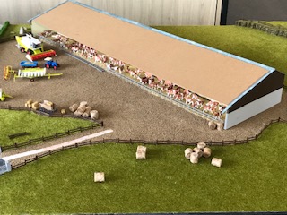 Le hangar agricole a été fabriqué de toute pièce à partir de planches de médium découpées aux dimensions et recouvert de feuilles de décor adaptées (bardages métalliques et planches de bois).