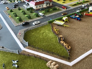 L’échelle HO avait été choisi par le client et de la même façon, l’ensemble des éléments de décors avait été préalablement commandé : bâtiments, tapis de sol, végétations, matériel agricole divers, etc. Par ailleurs, les délais de fabrication étaient aussi contraints.