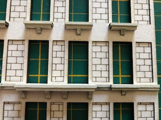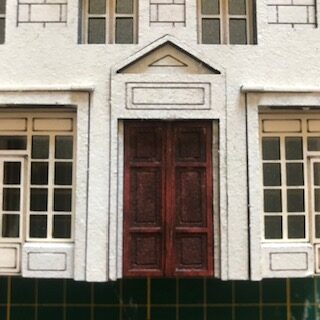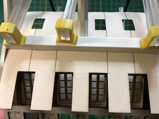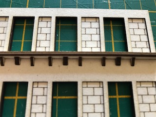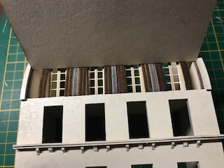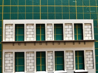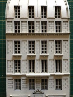 La structure principale de la façade avant est à présent terminée. Ne montez pas les huisseries pour l’instant ! Comme vous pouvez le constater au fil des photos, il est possible de peindre au fur et à mesure les tranches visibles. Nous avons fait le choix pour cet immeuble d’une teinte ivoire (RAL 1013 pour être précis) proche de la couleur du carton bois mais tout autre choix – de blanc à jaune clair est possible. Ces immeubles étaient construits en pierre calcaire dont la couleur varie selon les régions.