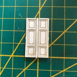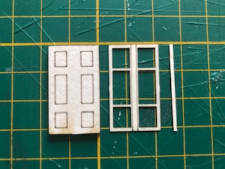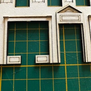 Les huisseries sont groupées sur la plaque par rangées de 4 et dans l’ordre des étages : le dernier étage en haut (que vous avez déjà collé) et le 1er étage en bas. Ne les mélangez pas quand vous les installez et terminez un étage avant d’entamer le suivant.
