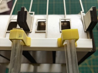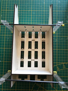 Les planchers s’insèrent facilement dans les ergots de positionnement prévus à cet effet. Faites attention à l’équerrage. Nous vous recommandons de ne coller que les deux planchers illustrés par la photo ci contre pour l’instant. Les façades latérales seront collées en place à l’issue. Nous vous recommandons de maintenir l’ensemble avec des joints souples le temps du collage