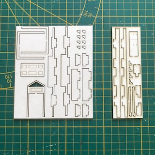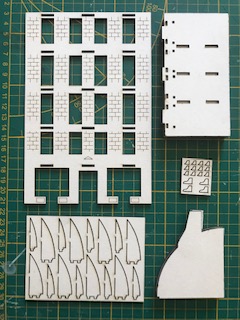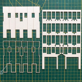 Diverses planches en papier Canson regroupent les huisseries et les persiennes. vous trouverez aussi le set en laiton permettant de réaliser balcons et appuis de fenêtres. Enfin, vous trouverez le set de briques pré-découpées pour ceux qui auront choisi la version « habillage briques » de l’immeuble.