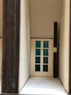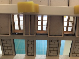 Vous collerez au bas des porte-fenêtres les petites pièces en Canson gris. Servez vous des traits de gravure pour bien les aligner.