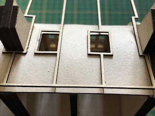 Nous vous conseillons de passer dans un premier temps au pinceau deux couches de peinture sur les tranches visibles qui ont été découpées au laser si vous ne l’avez pas fait au fur et à mesure (balcons et supports de balcons, tranches des huisseries notamment). Cela vous évitera de devoir trop insister sur ces zones lorsque vous peindrez l’ensemble de la maquette.