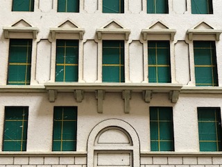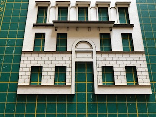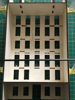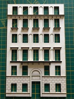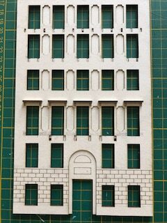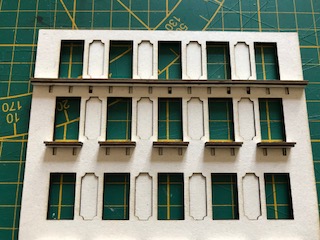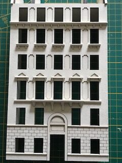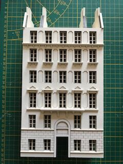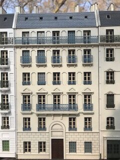 La structure principale de la façade avant est à présent terminée. Ne montez pas les huisseries pour l’instant ! Comme vous pouvez le constater, il est possible de peindre au fur et à mesure les tranches visibles. Nous avons fait le choix pour cet immeuble d’une teinte ivoire (RAL 1013) proche de la couleur du carton bois mais tout autre choix – de blanc à jaune clair est possible. Ces immeubles étaient construits en pierre calcaire dont la couleur varie selon les régions.