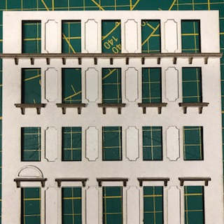 Pour le balcon du 2ème étage, les supports se trouvent sur la planche de 2.2 mm et 1 mm. Les modénatures au dessus des portes fenêtres se trouvent aussi sur la planche de 1 mm. Au choix, vous pouvez choisir les demi cercles ou les triangles.