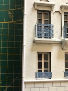 Un point de gravure indique les points de perçage des balcons. Coupez, mettez en formes et collez les ferronneries de balcon à l’issue.