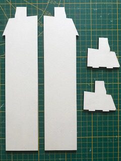 Les supports de toiture sont constitués par 2 pièces en carton bois de 3 mm à placer à l’aide des ergots de positionnement. Il faudra leur adjoindre 2 pièces en carton bois de 2.2 mm collées à l’intérieur. Les deux autres supports de toitures en carton bois de 2.2 mm seront collés contre les deux façades de côtés à l’intérieur.