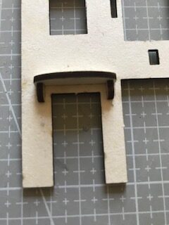 Ces pièces sont à installer en haut des 3 ouvertures de l’avancée comme illustré sur les deux photos qui suivent. Faites attention et ne confondez pas, le support de bas de fenêtre du 1er étage de l’avancée se trouve sur la planche de 1 mm.
