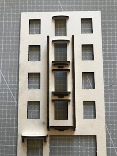 Prélevez et coller les pièces dédiées aux balcons et aux hauts de fenêtres. Elles doivent s’insérer légèrement à force. Poncez très légèrement si besoin.