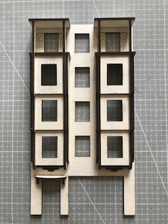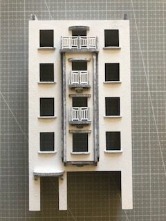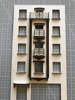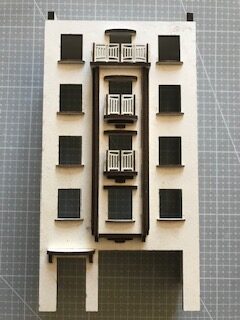 Cet immeuble possède 4 balcons sur un côté et un passage. C’est un immeuble passe-partout qui s’insérera très facilement dans vos décors. Il est fourni en option avec des murs permettant de représenter une arrière-cour. Il pourra alors évoquer une façade arrière.