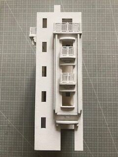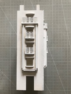 Voilà le balcon terminé vue de dessus. La pièce supérieure vient se coller sur la largeur de la porte. (NDLR : ne vous étonnez pas de l’aspect, une finition crépie a été appliquée sur cet immeuble). Procédez de façon identique pour le deuxième balcon.