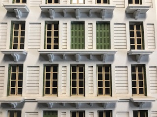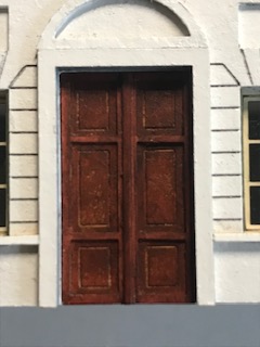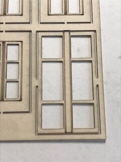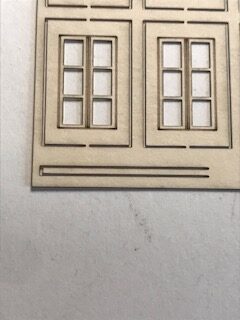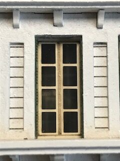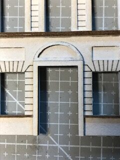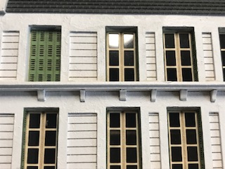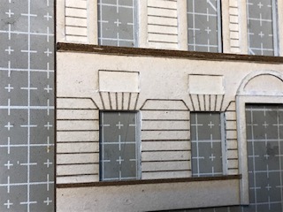 Vous pourrez aussi réaliser l’habillage de la porte d’entrée (ci-contre) : pièce de 2.2 mm pour l’entourage de la porte et pièce de 1 mm pour le haut (au choix, pièce arrondie ou triangulaire). Au RDC et au premier étage, vous collerez (ci-dessous) les éléments de modénatures (pièces de 1 mm). Une seule épaisseur pour le RDC et deux épaisseurs de 1 mm pour le 1er étage.