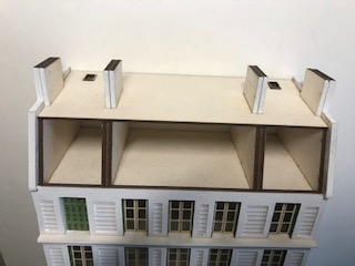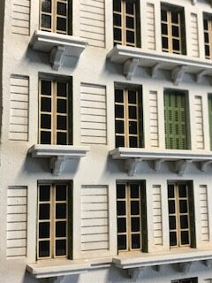 À ce stade du montage, c’est à dire après avoir installé les principaux éléments de la façade avant, les 3 planchers et collé les façades latérales, nous vous recommandons de procéder à la peinture de votre immeuble. Ce travail doit être fait avant le montage des huisseries, des persiennes, et des éléments finaux de toiture.