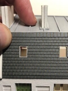 Et au recto, elles doivent être en légère saillie. Passez une couche de peinture grise sur ces fenêtres de toit avant de finaliser la mise en place des rangées d’ardoises. Comme montré sur cette photo, les bandes d’ardoises sont déjà pré-découpées et il faut les coller les unes sur les autres en suivant les lignes de gravure. Il faut partir du bas du toit et monter jusqu’au haut du toit.