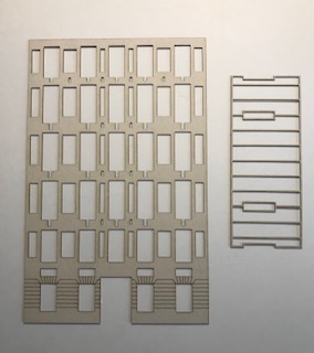 La première étape consiste à coller l’habillage de 0.75 mm sur la base de la façade en carton bois de 2.2 mm. Procédez avec soin de façon à ce que cette superposition s’ajuste parfaitement. À l’issue, vous pourrez installer les balcons qui viennent s’insérer au bas des ouvertures. Vous utiliserez les balcons de 1.5 mm pour les 2ème, 3ème et 4ème étages (superposition de deux épaisseurs de 1.5 mm), le balcon du 2ème étage étant légèrement différent des deux autres.