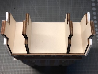 Sur cette photo d’un prototype, vous pouvez mieux vous rendre compte du détail du haut de façade. Les deux pièces composant la façade avant (support de 2.2 mm et habillage de 0.75 mm) viennent se caler dans l’ergot de positionnement des façades latérales. Vous collerez les deux façades latérales de la même facon.